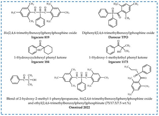 The compounds belonging to the group of acylphosphine oxides (APOs) have a narrow absorption band in the long UV region, which makes them perfect to depth cure. Moreover, the non-yellowing and photobleaching properties enable the use of these initiators in thick and highly pigmented compositions. On the other hand, benzoin ethers (BEs) may cause yellowing of the coating, but show high performance for curing of unsaturated polyester/styrene formulations. For example, the α-hydroxyalkyl ketones (HPs) are mainly used in clear coatings, overprint lacquers, adhesives, topcoats for plastics, metals, wood, etc. In addition, systems containing more than one initiator (known as blends) are also available on the market. For example, commercial photoinitiator Omnirad 2022 is a highly efficient curing agent used for initiation of radical polymerization of unsaturated resins based on the prepolymers [55,62,63,64,65].