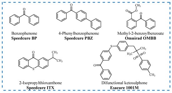 One of the best known type II PIs is benzophenone and its derivatives. Importantly, an appropriate modification of the structure of BP results in the extension of the absorption band to the visible region of the spectrum and an improvement in reactivity. Other significant groups of photoinitiators include camphorquinones and thioxanthones. For example, Speedcure ITX is a high-performance initiator which, in combination with an amine synergist, induces rapid photopolymerization reactions. The most important advantage of this PI is good solubility in most popular organic solvents and monomers as well as intensive absorption. On the other hand, difunctional ketosulphone—known also under commercial trade as Esacure 1001 M—is suitable for all systems where low migration is needed. Moreover, such features as high reactivity, minimal post-curing odor and very low volatile organic compound emission (VOCs) makes it appropriate for use not only in the chemical industry but also in food packaging [62,68].