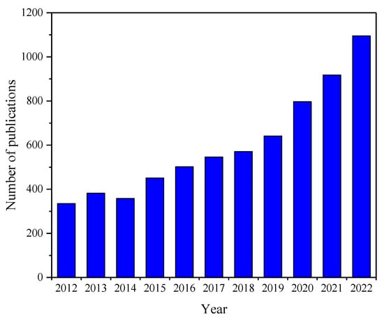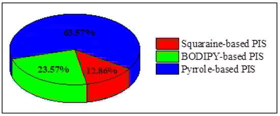 Over the years, numerous color compounds have been synthesized, studied and described by diverse research groups. Nevertheless, the need for various types of dyes is still enormous due to their applicability in various fields of science and technology [69]. Apart from the basic use of these compounds, which is the coloring of different types of materials, another important area is the use as sensitizers in photopolymerization reactions. The interest in the design of new photoinitiators, including photoinitiating systems based on dyes, is huge, as evidenced by the numerous papers published in this field. The data analysis of numbers of publications on the discussed topic with regard to the scientific community clearly indicate that, since 2012, a total of 6964 research works focused on photoinitiators were published. It should be noted that a pronounced increase of the number of published documents in every year is observed, as is shown in Figure 4.