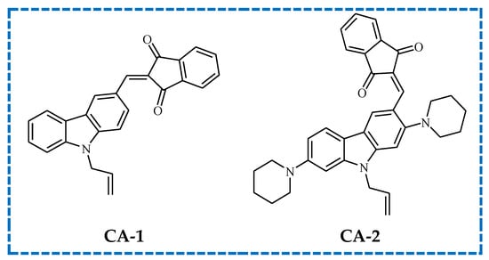 One of the latest developments in the design of dye-based photoinitiating systems are carbazole-indanedione-based photoinitiators described by Liao and co-workers. The group of scientists presented the sensitizing abilities of novel dyes (chemical structures of these dyes are presented in Figure 6), which show absorption in the UV-Vis range.
