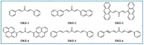 These compounds—proposed by Deng and Qu—are characterized by a wide range of absorption, from 300 nm to 500 nm, and quite high molar absorption coefficients, about 5 × 104 M−1 × cm−1. The photopolymerization experiments were carried out for three-component systems consisting of an appropriate bis-chalcone sensitizer (DKE-1–DKE-6), diphenyliodonium hexafluorophosphate (Iod) and triethanoloamine (TEOA). The highest kinetics parameters of polymerization of poly(ethylene glycol) diacrylate (PEGDA) under 405 nm LED were obtained for compositions containing 0.1 wt% DKE, 2.0 wt% Iod and 2.0 wt% of TEOA. For these systems, the values of final monomer conversion ranged from 60% to ca. 90% for the most effective PI. Besides high conversion rates, newly synthesized initiators show good solubility in various monomers and a low migration ratio. Due to low toxicity, the proposed photoinitiating systems can be successfully used in the medical sector, e.g., as initiators of polymerization of light-cured dental compositions [74].