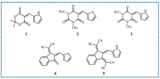 An interesting group of sensitizers of polymerization reactions are push–pull dyes. These compounds are composed of electron-donating and an electron-accepting moieties connected by means of a π-conjugated spacer. Indeed, this chemical structure provides the opportunity to finely tune absorption spectra, which is important for the easier matching of sensitizer to the light source used. Taking into account that push–pull dyes exhibit high molar extinction coefficients (ε), these compounds are suitable candidates for practical applications, e.g., in optoelectronics [75,76]. The use of this type of dye in three-component photoinitiating systems was described in 2021. The push–pull dyes were combined with two different co-initiators, such as an iodonium salt (Speedcure 938) and a tertiary amine (ethyl dimethylaminobenzoate, EDB), and examined for photosensitization capabilities of the polymerization reaction of tetrafunctional polyether acrylate (TA). The proposed sensitizers (chemical structures are presented in Figure 8) showed high light-absorption properties from 320 nm to even 600 nm. The irradiation of a polymerizable mixture with LED light (wavelength: 405 nm) resulted in high monomer conversion values above 90%. Importantly, the described initiators are characterized by short induction time of polymerization, whereby the curing of compositions occurred within 60–400 s. Surprisingly, some sensitizers in the presence of iodonium salt and amine also initiated polymerization processes with sunlight [76].