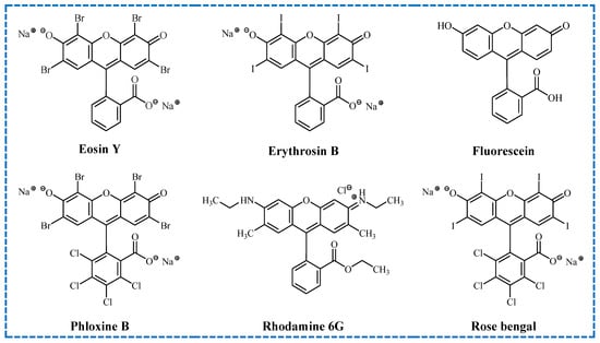 Among activators from the group of organic dyes used in photoinduced electron/energy transfer–reversible addition–fragmentation chain transfer polymerization, the following should be mentioned: eosin Y (EY), erythrosin B (EB), fluorescein (Fl), phloxine B (PB), rhodamine 6G (R6G), rose bengal (RB), etc. (Figure 9) [92,93,94,95,96].