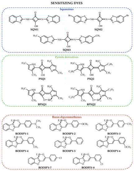 - Yang, L.; Zhu, Y.; Wu, J.; Hu, B.; Pang, Z.; Lu, Z.; Zhao, S.; Huang, Y. Squaraine dyes containing diphenylamine group: Effects of different type structures on material properties and organic photovoltaics performances. Dyes Pigm. 2019, 171, 107763. [Google Scholar] [CrossRef]