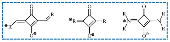 Squaraines (SQs), known also as squarylium dyes, belong to the family of polymethines. Their characteristic feature is the donor–acceptor–donor (D-A-D)-type π-conjugated structure, in which the central unit is a four-membered ring derived from 3,4-dihydroxycyclobut-3-en-1,2-dion (called squaric acid) connected with two electron-donor groups. Depending on the type of substituents (R), symmetrical and unsymmetrical squaraines can be distinguished. Taking into account the chemical structure, there are three different types of squaraines, as presented in Figure 14 [116]. The basic synthetic route is the condensation reaction of 1 eqv. of squaric acid with 2 eqv. of systems containing electron-donating moieties [117,118,119,120].