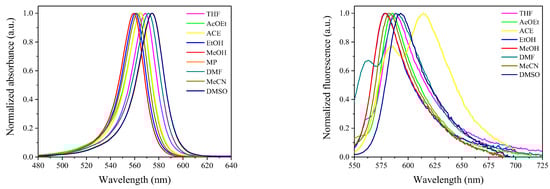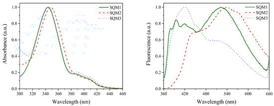 Normalized absorption (L) and fluorescence (R) spectra of squaraine dyes (SQM1-SQM3) registered in 1-methyl-2-pyrrolidinone (MP) at room temperature. Reproduced from ref. [113], which was published under a CC BY license.