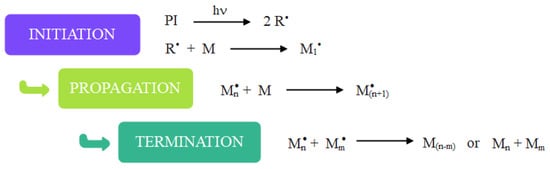 Photopolymerization is a process in which a light source provides the energy necessary to initiate a chain reaction and cause a rapid conversion of liquid monomer/oligomer into solid linear or crosslinked polymer [46]. The activation of photopolymerization requires not only light energy but also the presence of a suitable initiator. This compound is a driving source of the polymerization process because it enables the formation of initiating radicals. Therefore, it can be concluded that these two factors are decisive for efficient photopolymerization. In general, radical polymerization includes three fundamental steps—initiation, propagation and termination—which are presented in Scheme 1 [47].