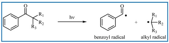 Type I photoinitiators are unimolecular initiators, which undergo a homolytic or heterolytic bond cleavage after light excitation forming two initiating centers. Depending on the type of mechanism of generation of active radicals, photoinitiators can be divided into two groups, namely, α- and β-cleavable. Definitely, the most commonly used compounds are α-cleavable Norrish type I initiators. In this case, the photolysis occurs at the carbonyl alpha atom on the weak C=O-alkyl bond. On the other hand, the presence of a weak bond in the beta-position, e.g., C-Cl, C-N or C-S, makes it susceptible to cleavage at this place. The general mechanism of generating initiating radicals in photoinitiating systems containing α-cleavable PI (benzoin) is presented in Scheme 2 [55,56,57].