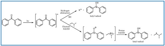 One of the possible directions of reactions is based on hydrogen abstraction by the long-lived n-π* excited triplet state from the donor molecule. As a result, a very active donor radical is formed. The donors contain heteroatoms with active hydrogen atoms in the α-position, e.g., alcohols, ethers, esters, tertiary amines, thiols and others. If the donor is tertiary amine, the primary reaction is an electron transfer process (ET) from the nitrogen atom to an excited state of an electron acceptor, which leads to the formation of a radical ion pair: radical cation/radical anion. Then, the proton transfer process from α-carbon atom to the donor leads to the formation of two radicals: ketyl and α-aminoalkyl [62,65,66].