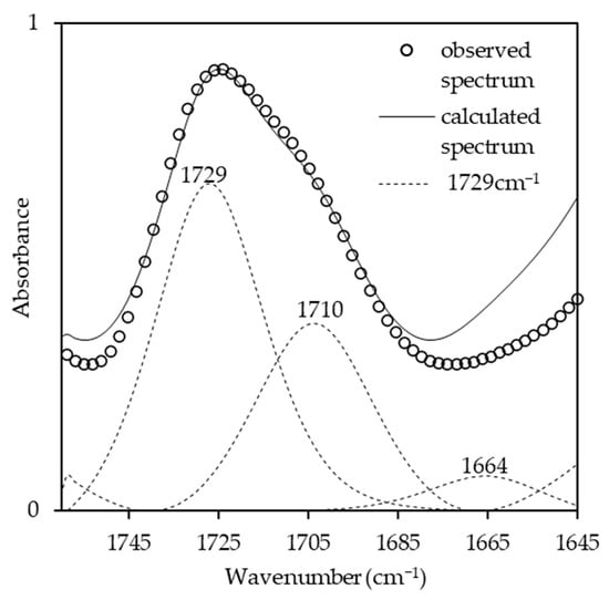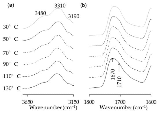 The effects of the NCO/OH ratios were studied by blending the AMpolyol with pMDI at different NCO/OH ratios (Table 2). The chemical structures of the BIO-PU films were analyzed using FT-IR spectroscopy. All the FT-IR absorbances were normalized at 2906 cm−1 (Figure 5a). Obviously, the broad (N–H) peak located at 3460 cm−1 reduced, became much sharper and shifted to 3310 cm−1 with an increasing NCO/OH ratio (Figure 5b), which is correlated with its tendency to form hydrogen bonds within hard segments [2]. The formation of amide groups was also enhanced, which is dependent on the NCO/OH ratio (Figure 5c). The non-hydrogen bonded C=O peak at 1730 cm−1 increased while the presence of an absorbance peak as a shoulder was enhanced in accordance with the NCO/OH ratio. The curve-fitting method was performed on the recorded spectra. Three Gaussian–Lorentzian sums were considered in the curve fitting of the carbonyl region (Figure 6) at 1729 cm−1, 1710 cm−1 and 1664 cm−1, where they corresponded to C=O free urethane, C=O H-bonded urethane and C=O urea [4], respectively. Distinctly, the formation of urea (1664 cm−1), which is not present initially (Table 2), becomes a stronger shoulder with an increasing NCO/OH ratio. The water molecules in the polyol reacted with the isocyanate and produced unstable carbamic acid before disintegrating into amine and carbon dioxide (CO2) [12]. Further reactions among the amine and another isocyanate led to urea formation. The formation of urea was also induced by the temperature (see Figure 3b). The integrated absorbance for all the bands increased with an increasing NCO/OH ratio. Accordingly, a 2D-COS analysis was used to investigate the formation of hydrogen bonds in the carbonyl region dependent on the NCO/OH ratio. The strong autopeak observed at 1710 cm−1 (Figure 7a) demonstrates that the C=O H-bonded urethane has the most significant intensity changes with an increasing NCO/OH ratio. In the corresponding asynchronous spectrum (Figure 7b), the band at 1710 cm−1 has been split into a 1730 cm−1 band. The negative sign of the cross peak at 1710/1730 shows a positive sign in the corresponding spectrum, reflecting the following sequence: 1730→1710 cm−1. It reveals that the absorbance band at 1710 cm−1 is enhanced depending on the NCO/OH ratio, and the changes of the 1710 cm−1, which occurred later, reveal that the C=O H-bonded urethane deviated in a slow process that was stimulated by the changes in the free urethane (1730 cm−1).