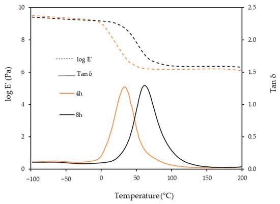 Figure 4 shows the storage modulus (E′) and tan δ of the BIO-PU films after heating at 4 and 8 h, respectively. The BIO-PU films are in a glassy state at temperatures below 0 °C, and it decreases slightly with the temperature. A rapid decrease in the E′ is observed in the temperature range between 0 and 100 °C, corresponding to the primary relaxation process of the resulting materials. The decrement of this modulus corresponds to an energy dissipation and the maximum is observed in the tan delta curve. A distinct shifting of glass transition (Tg) from 35 to 62 °C occurs when the heating time is increased from 4 to 8 h, suggesting that the films become harder due to the restricted movement of the soft segment chains caused by the higher crosslinking [12]. In addition, the obviously greater enhancement in the rubbery plateau region for 8 h reveals that lengthening the heating time had induced net-points cross-linking, which leads a stronger intermolecular and intramolecular hydrogen bond.
