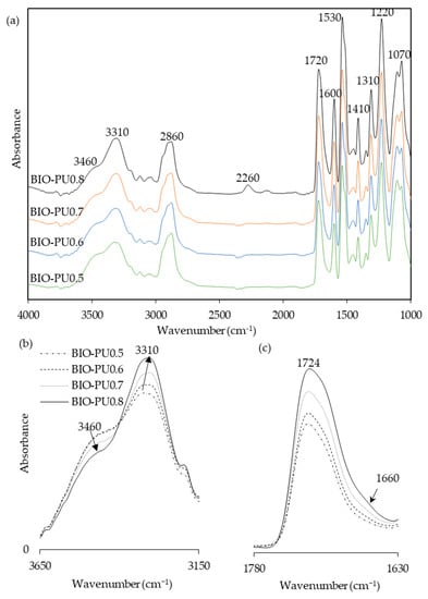 (a) FT-IR spectra, (b) NH-stretching region, and (c) amide region of BIO-PU films at different NCO/OH ratios.