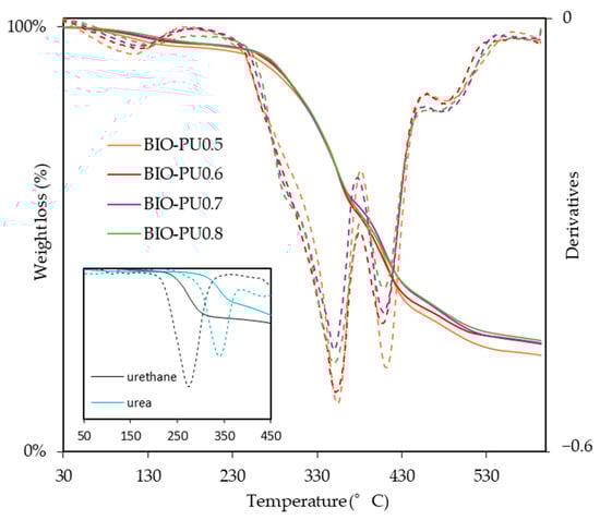 The effects of the NCO/OH ratio on the TG curves of the BIO-PU films at the NCO/OH ratios of 0.5, 0.6, 0.7 and 0.8 are shown in Figure 8, and the corresponding data are summarized in Table 3. The derivative of the weight-loss curves shows the existence of five thermal degradation curves pinpointed at ca. 110 °C, 280 °C, 350 °C, 410 °C and 480 °C. The initial mass loss around 70–160 °C is related to the dehydration of the solvent and entrapped moisture in the film. The temperature of 10% weight loss showed the thermal degradation depending on the NCO/OH ratio, and a higher temperature is required to obtain the 10% weight loss of BIO-PU0.8 compared to the other ratios. The degradation processes in this temperature range of 270 to 300 °C correspond to the urethane linkages, which is also illustrated in the inset. The decomposition step, which is derived from urea, happened in the third stage ca. 350 °C. Urea has a higher degradation temperature (340 °C) than urethane (270 °C) (inset in Figure 8). This is also supported by Long and Pisney [32], who state that urethane decomposition occurs between 290 and 370 °C, as observed via DSC. The fourth degradation stage occurs between 380 and 460 °C, corresponding to polyol. Petrovic et al. [33] reiterate that the dissociation of polyol is higher compared to the urethane bond. Markedly, BIO-PU0.5 which high polyol content shows a broad curve in this decomposition stage. Eventually, the high degradation ca. > 450 °C might be related to the isocyanurate linkages. The presence of excess isocyanate in the BIO-PU films might lead to isocyanurate linkage formation. The isocyanurate group is the most thermal stable structure in the polyurethane system, which is typically induced by trimerization among isocyanate at high temperatures [5,12,34].