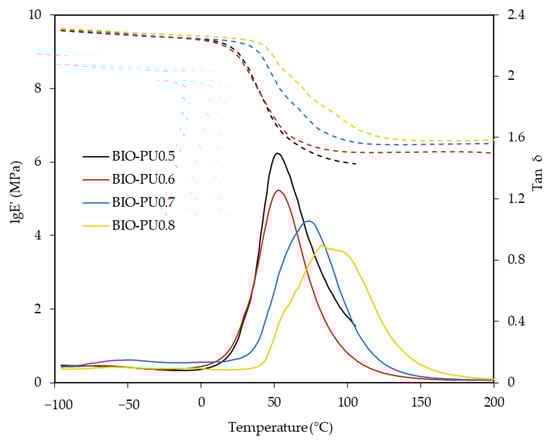 Storage modulus (dotted line) and tan δ (solid line) of BIO-PU films at different NCO/OH ratios.
