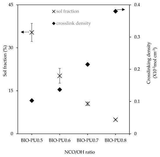 Crosslinking density and sol fraction of BIO-PU films at different NCO/OH ratios (n = 3).