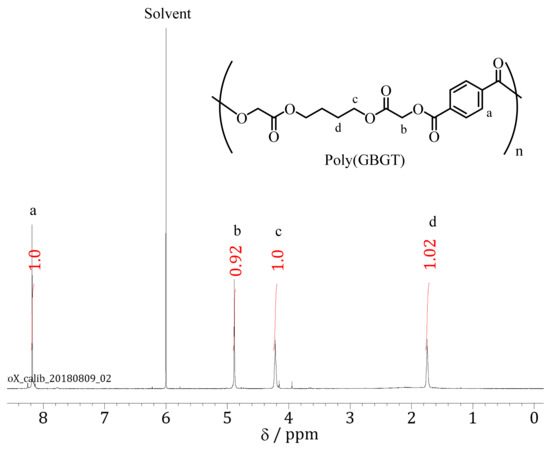 1,4-Butylene diglycolate (GBG) and 1,3-propylene diglycolate (GPG) were synthesized by the reaction of 1,4-dibromobutane or 1,3-dibromopentane with potassium glycolate in N,N-dimethylformamide (DMF), similarly to GEG (Scheme 1) [13]. After the reaction of 1,4-dibromobutane or 1,3-dibromopentane with potassium glycolate, the acetone solution of the crude product was filtrated through silica gel followed by evaporation to give GBG in 67% yield. The 1H NMR spectrum of GBG is shown in Figure 1. GPG was purified by silica gel column chromatography and recrystallization and obtained in 40% yield (Figure S1).