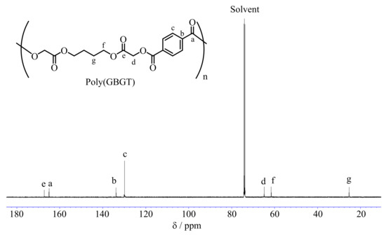 Similarly to the synthesis of poly(GEGT) [13], the polycondensation of GBG or GPG with terephthaloyl dichloride (TC) gave the corresponding sequence-controlled copolyesters, poly(GBGT) and poly(GPGT), respectively (Scheme 2, Table 1). The obtained poly(GBGT)s were hardly soluble in common organic solvents such as tetrahydrofuran (THF) and chloroform, so their GPC analysis was performed using 1,1,1,3,3,3-hexafluoro-2-propanol as an eluent to indicate their rather low molecular weight (Mn ≤ 2,400). The attempted polycondensations of GBG with TC under various conditions such as different feed ratios of GBG or GPG against TC, different solvents (1,1,2,2-tetrachloroethane (TCE, DMF, dimethyl acetamide (DMAc), and dimethyl sulfoxide (DMSO)) and different temperatures did not enhance the molecular weight of the resulting poly(GBGT). The obtained poly(GPGT) (Figure S2) had a slightly higher molecular weight than that of poly(GBGT) and was also insoluble in THF but soluble in CHCl3. The lower polymer yield of poly(GPGT) than that of poly(GBGT) should come from the higher solubility of poly(GPGT) in the precipitation solvent, MeOH. This could be attributed to the lower crystallinity of poly(GPGT) than that of poly(GBGT) (vide infra). The 1H and 13C NMR spectra of poly(GBGT) were recorded in TCE-d2 at 130 °C as shown in Figure 2 and Figure 3, respectively. The spectra showed four (1H NMR) and seven (13C NMR) sharp signals, respectively, indicating the regular comonomer sequence of the copolymer as expected.