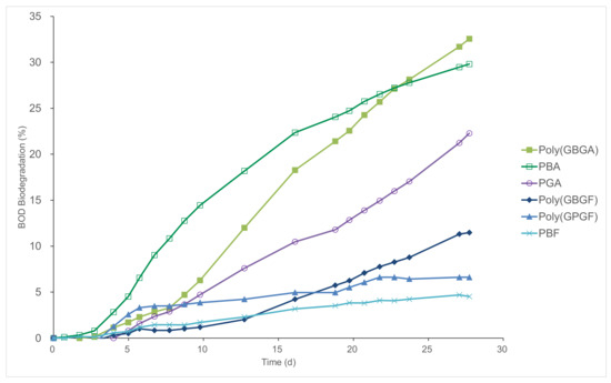 The poly(GBGF) and poly(GPGF) samples exhibited 11.5% and 6.5% biodegradation after 28 days, respectively, which are intermediate between those of PGA (22.3%) and PBF (4.5%). Therefore, the biodegradability of the poly(GBGF) and poly(GPGF) were improved in comparison with PBF by the introduction of glycolate units. The poly(GBGF) and poly(GPGF) have higher biodegradability than representative biodegradable copolyester, poly(butylene adipate-co-terephthalate) (PBAT), which was reported to show the BOD biodegradation of around 1% after 4 weeks in similar laboratory tests [41], although lower than that of poly(GEGT), which showed a biodegradation of 30% within 29 days [13]. The slow but certain biodegradation of the PBF homopolymer sample was observed, possibly due to its relatively low molecular weight. PBA was reported to show higher biodegradability in seawater than poly(butylene succinate) and poly(ethylene succinate) [40]. The poly(GBGA) sample showed a high biodegradation of 32.6% after 28 days similar to that of PBA (29.8%). The slower biodegradation of the PGA than those of the PBA and poly(GBGA) samples could come from the higher molecular weight of the used PGA sample.
