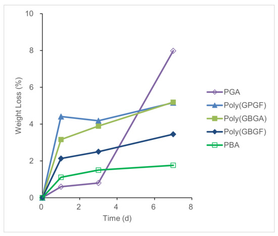 PGA has high hydrolyzability, which leads to its high biodegradability and also to low stability in ambient conditions to limit its applications [3,4]. Figure 5 shows the results of the hydrolysis tests of these polymers at 45 °C. The degradation degrees in these tests were determined from the total organic carbon (TOC) measurement of the supernatant solution. The weight loss on the first day is assumed to be due to the elution of the originally contained water-soluble low molecular weight components. Table 5 shows the difference in the weight loss between the first day and the seventh day as an index of hydrolyzability. Among these polymers, PGA showed a much higher hydrolyzability of 7.4% than other polymers despite its higher molecular weight. The poly(GBGF) and poly(GPGF) with furandicarboxylic acid units showed low hydrolyzability of 1.3% and 0.8%, respectively. Poly(GBGA) showed slightly higher hydrolyzability (2.0%) than poly(GBGF) and poly(GPGF) but still much lower than PGA. Thus, the poly(GBGF), poly(GPGF), and poly(GBGA) have improved stability in comparison with PGA. PBA and poly(GBGA) have both high biodegradability in seawater and low hydrolyzability. The corresponding random copolymer of poly(butylene adipate-co-glycolic acid) with a similar composition (glycolate-content = 60 mol%) was reported to show higher hydrolyzability than PGA [26]. We speculate that the lack of continuous glycolate units in the poly(GBGA) should contribute to its lower hydrolyzability. Thus, the controlled incorporation of glycolate units into copolyesters realized both the suppression of hydrolysis as well as improved biodegradability.