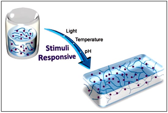 Schematic illustration of a stimuli-responsive hydrogel which shows a change in properties against internal or external stimuli. Reprinted with permission from Ref. []; Copyright 2013, De Gruyter.