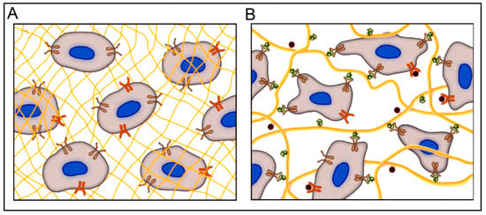 A hydrogel matrix composed of (A) synthetic polymers (yellow mesh) provides a 3D environment for culturing cells; however, they fail to activate integrins (brown) and other surface receptors (orange), and (B) formed from naturally derived polymers present a myriad of integrin-binding sites (green) and growth factors (red) coordinated to the ECM (yellow fibers). Reprinted with permission from Ref. []; Copyright 2009, Wiley-VCH.