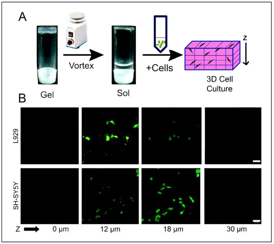 (A) Schematic depicting entrapment of cells inside thixotropic peptide gels. (B) 3D cell culture using hydrogel showing cell viability of both SH-SY5Y and L929 cells indicated by calcein-AM staining (green) inside the 3D gel matrix. Scale bars are 50 mm. Reprinted with permission from Ref. []; Copyright 2015, Elsevier.