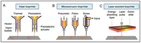 Since its first description in 1986 by Charles Hull, 3D printing has gained much momentum regarding its application in the biomedical field []. Types of 3D printing include additive manufacturing, rapid prototyping, or solid-free form. It commences with meshed computer-aided design, which is then used to acquire the product usually formed by layer-by-layer (LbL) addition [,]. 3D bioprinting represents a technology that uses biomaterials, cells, and biological molecules to generate 3D constructs/scaffolds and is primarily used for developing organotypic constructs and regenerative medicine [,]. The emerging interest in 3D bioprinting is fueled by the high degree of freedom in design, high-precision and reproducible results, and the availability of affordable printers []. Several fabrication methods could be applied for 3D printing, such as inkjet printing, extrusion-based, Laser-Induced Forward Transfer, and robotic dispensing, as illustrated in Figure 5 [,]. A detailed overview of these methods has been explained elsewhere []. In the case of bioprinting, several other advanced techniques with high resolution and reproducibility have emerged, such as cellular inkjet, lithography, and extrusion bioprinters [].