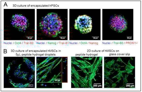 Despite the many advantages of peptide hydrogels as bioinks, the number of studies is limited. Loo et al. have demonstrated the suitability of self-assembling peptide-based hydrogel as bioinks for constructing 3D scaffolds for cell proliferation and differentiation. Lys-containing hexapeptides used as bioinks can form a 3D scaffold that supports human mesenchymal stem cells (hMSCs) and organotypic differentiation of primary cells []. The authors demonstrated the successful proliferation of Human H1 embryonic stem cells (ESCs) into 3D spheroids (Figure 6A) and hMSCs (Figure 6B) when using Lys-containing hexapeptide-based hydrogels as bioink []. Raphael et al. described a new and optimized extrusion-based 3D bioprinting method for mammary epithelial cells in a commercially available self-assembling peptide hydrogel (PeptiGelDesign Ltd., Cheshire, United Kingdom). The cells could survive and proliferate in 3D-printed constructs during the seven-day culture [].