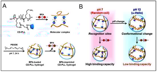 Schematic representation of (A) the preparation of the (Bisphenol A) BPA-imprinted β-cyclodextrin-poly(L-lysine) (CD-PLL) hydrogel by molecular imprinting. (B) BPA-responsive behavior of the BPA-imprinted CD-PLL hydrogel at neutral or basic pHs. Reprinted with permission from Ref. [], Copyright 2017, American Chemical Society.