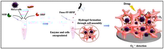 Another exciting application for biosensors is the detection of the superoxide anions released from the cells in 3D culture in response to drug molecules. Lian and co-workers developed Fmoc dipeptide as a matrix incorporated with HeLa cells and two cascade enzymes, HRP, and superoxide dismutase (SOD), as illustrated in Figure 8. This system demonstrated accurate and sensitive detection of released anions and their generation dynamics under physiological conditions [].
