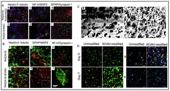 - Iwasaki, M.; Wilcox, J.T.; Nishimura, Y.; Zweckberger, K.; Suzuki, H.; Wang, J.; Liu, Y.; Karadimas, S.K.; Fehlings, M.G. Synergistic effects of self-assembling peptide and neural stem/progenitor cells to promote tissue repair and forelimb functional recovery in cervical spinal cord injury. Biomaterials 2014, 35, 2617–2629. [Google Scholar] [CrossRef]