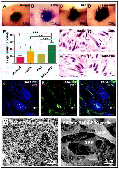 - Wang, X.; Wang, J.; Guo, L.; Wang, X.; Chen, H.; Wang, X.; Liu, J.; Tredget, E.E.; Wu, Y. Self-assembling peptide hydrogel scaffolds support stem cell-based hair follicle regeneration. Nanomed. Nanotechnol. Biol. Med. 2016, 12, 2115–2125. [Google Scholar] [CrossRef]