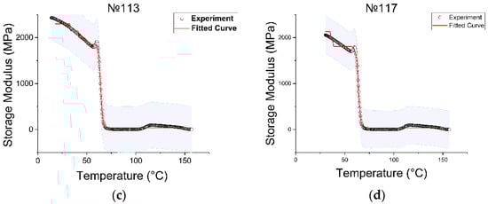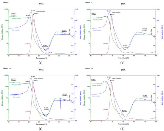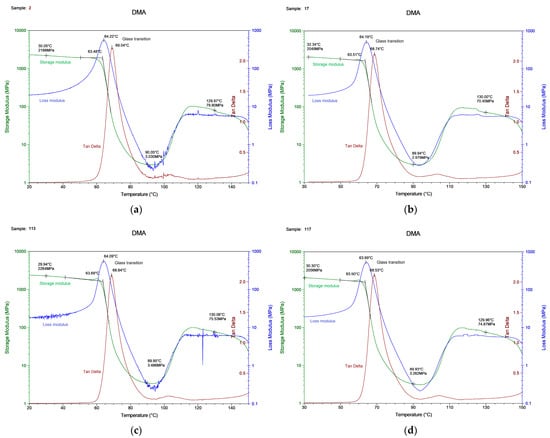 The DMA experiment showed that, regardless of the configuration of the printing process, the values of the glass transition temperature of the elasticity modulus at the initial stage of the curve were in the same range, and did not differ from each other by a value greater than 1–2%. The glass transition temperature for all samples with different measurement curves ranged from 63 to 69 °C. This is quite acceptable, given that the values of the glass transition temperature obtained within the same curve (for example, the curve of the storage module) differed within 1 °C. The output values confirmed our assumption that the DMA was not sensitive to the internal parameters of the FDM part, and that only the material under study is important. Similar conclusions were drawn by Bopp and Behrendt in [46], who demonstrated that frequency dependence in DMA is constant across a wide range of parameter settings.