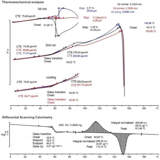 The coefficient of thermal expansion (CTE) was determined from the TMA measurements. From the upper part of Figure 2, we observed how significant different CTE was not only found in different directions, but also in the first heating, second heating, and cooling run. The cyclical heating–cooling–heating method is commonly applied in TMA studies to eliminate the thermal history and reduce the internal stresses in the sample. The transition temperatures are determined by the sample’s internal stresses, and hence its thermal history. This explains why the curves observed in the first and second heating runs had distinct forms.