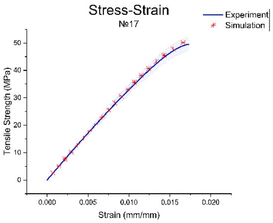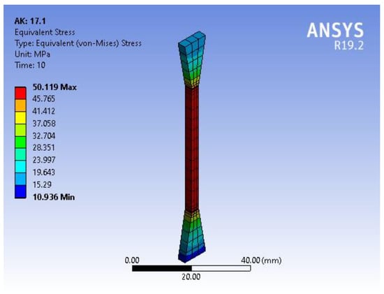 Below, we demonstrate the outcomes of the Ansys numerical approach on a single specimen out of 480. Figure 3 shows the simulation of the dog-bone specimen for a tensile test based on the experimental data for printing regimen no. 17, which presented the highest tensile strength. The difference between the experimental and simulation data is presented in Figure 4.