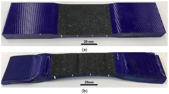 Uniaxial tensile tests were carried out on a servo-hydraulic testing machine Instron 8801 (Instron, Norwood, MA, USA) equipped with a temperature chamber and an optical window to conduct observations inside the chamber. The overall length was set to 210 mm, the gauge length of sample was 60 mm, and the cross-section was 50 mm 7 mm. Deformation control was carried out using the Digital Image Correlation method (DIC) [30,31]. Vic-3D (Correlated Solutions, Irmo, SC, USA) software was used to keep track of the shooting and process the photos that were captured. Figure 1 shows sample no. 17 during the first and fifth cycles with a field of measurement in the DIC system before and after mechanical testing.