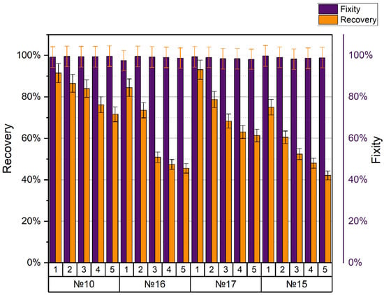 Thermocycle tests showed that the samples had a SME. For this study, the samples were divided into groups with the best mechanical and worst mechanical properties as well as those modes that showed average strength values, but did not fall into the typical trend of the ANOVA curve. Sample no. 10 (nozzle diameter 0.5 mm, layer height 0.2 mm, with a line filling of 80%, and an extruder temperature of 240 °C) showed one of the highest tensile strengths (50.1 MPa) and the best values of the shape recovery coefficient for five cycles. There was a slight deterioration from cycle to cycle, but its drop was significantly less than in other samples (2–6%). The worst values were demonstrated by sample no. 115 (nozzle diameter 0.3 mm, layer height 0.3 mm, with a line filling of 80%, and an extruder temperature of 210 °C). Since these two samples (no. 10 and no. 115) showed high and low values in tensile strength, respectively, we can believe that the strength featured had an effect on the shape recoverability. Speaking of the fixity ratio, with each cycle, it decreased by 0.1–1%; for all samples, the values were close to 100%.
