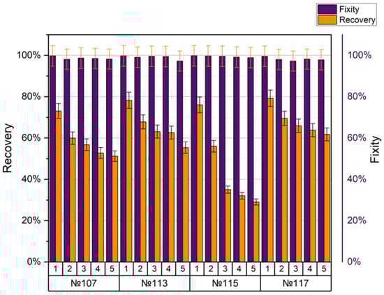 The following printing values were common for all modes (no. 107, no. 113, no. 115, no. 117): nozzle diameter 0.3 mm, layer height 0.3 mm, extruder temperature 210 °C. Comparing the two modes, no. 107 and no. 117, one with a grid filling of 25%, and the other with a gyroid of 25%, respectively, we can say that the coefficient of shape recovery for the first cycle was 73% and 79.2% and after five cycles, their values changed by 51.2% and 61.7%, respectively. For both modes, the average fixation coefficient was 98%. Samples no. 113 and no. 115 differed only in density (lines 50% for no. 113, lines 80% for no. 115). The coefficient of form recovery after the first cycle was 78.2% and 76%, and after the fifth cycle, it was 55.3% and 29%, respectively. For both modes, the average fixation coefficient was around 99%.