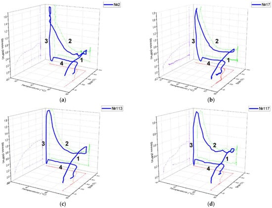The results of the stress–strain–temperature curve in 3D space for four different samples after the first cycle are shown in Figure 12. As expected, the stress–strain curve followed a linear trend for the first step (1), with a maximum strain value of 60%. As the temperature decreased, residual stresses accumulated due to the interaction of thermal and mechanical energy (2). The third stage showed stress relaxation and the ability of the material to memorize the shape, since the restriction is removed at low temperature (3). The shape was restored only after the temperature exceeded 64 °C (4). The deformation after the shape recovery stage was fixed at a level of more than 20%. The maximum stress value for mode no. 2 was 1.68 MPa, and the value of the final deformation was 0.23 mm/mm.