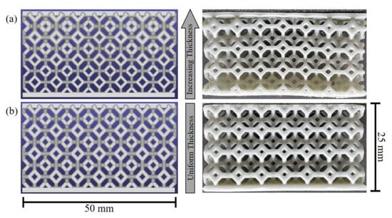 Multi-material as well as functionally graded lattices have also been studied to modulate the density in order to optimize both the mechanical, thermal and electromagnetic behavior [,,,,,,,,,,]. Brauer and Aukes [] investigated different methodologies to induce a spatially graded transition on 3D printed materials showing that the best performance can be achieved by a transition process that can provide an equilibrium between the gradual change in material properties and the mechanical bond.