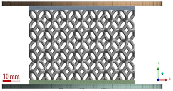 The geometry of the non-grade lattice was built in Solidworks® 2020 and imported into ANSYS® Mechanical. Figure 3 shows the full representation of the mesh considered for the non-graded geometry, which includes a bottom plate, the lattice itself, and an impactor. The bottom plate was fully restricted, and the impactor moved only in the y-direction; both were modeled as rigid bodies with structural steel material properties (E = 210 GPa, ρ = 7850 kg/m3, υ = 0.3). Lattice material was modeled with Ogden 3rd-order material model, the parameters were fitted using HYPERFIT® 2.181, details of this process can be found in []. Frictional contacts were defined between the plates and the lattice with static and dynamic friction coefficients of 0.2 and 0.05, respectively; a similar contact was considered between the lattice struts with coefficients of 1.5 and 1.0 for the static and dynamic coefficients, as described in []. A mass point was added to the impactor to match the 4.66 kg of the actual impactor, and standard earth gravity was considered. Initial velocity of 1.1 m/s was assigned to the impactor, which was assumed as the impact velocity from a 50 mm drop height.
