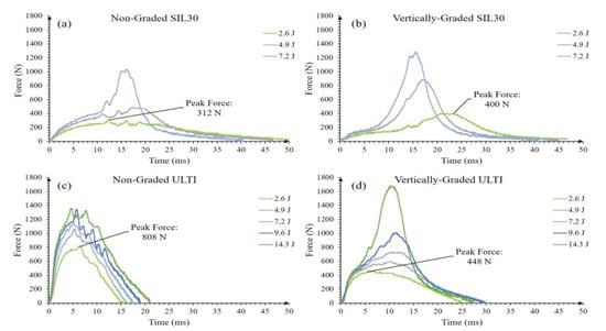 Force versus time of SIL30 and ULTI at different impact energies; (a) SIL30-NG (non-graded), (b) SIL30-VG (vertically-graded), (c) ULTI-NG, and (d) ULTI-VG with peak force values labeled for comparison.