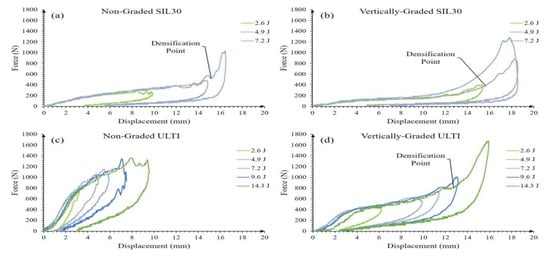 Force versus displacement of SIL30 and ULTI at different impact energies; (a) SIL30-NG, (b) SIL30-VG, (c) ULTI-NG, (d) ULTI-VG. Densification points are labeled; however, ULTI-NG does not show densification in these graphs due to its stiffness.