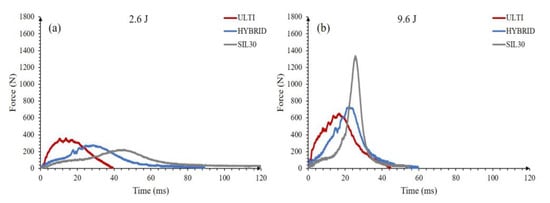 Low and high impact energies were chosen to evaluate a relatively large range of double-stacked vertically-graded samples’ performances (2.6 J and 9.6 J), as shown in Figure 8. The SIL30-VG deforms more than the ULTI-VG material when tested under low impact conditions. The SIL30-VG displays the maximum force at about 45 ms, a time more than four times larger than that of the ULTI-VG sample. This response is associated with the improved damping nature of the material. The soft profile of the SIL30-VG induces a lower peak force on the load cell when compared with the ULTI-VG. The hybrid lattice shows a response that lies between the SIL30-VG and the ULTI-VG regarding the response time and impact force. A different response is observed under higher impact conditions (9.6 J). The SIL30-VG sample displays a pronounced impact force due to the system reaching the densification threshold. At higher impact energies, the impact forces resulted in higher values when testing the SIL30-VG, since the impactor started striking the bottom plate supporting the samples. These results suggest that the hybrid system offers a blended compromise of both materials. During the impact event, SIL30-VG absorbs most of the initial impact energy, followed by the ULTI-VG when the former has exhausted the energy absorption capabilities. These characteristics suggest that the dynamic performance of lattices can be systematically tailored for targeting specific applications; increasing comfort by reducing stiffness and strut size and increasing high energy absorption capability by increasing stiffness and strut size are examples of this tailor ability.