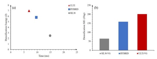 Figure 9a shows the maximum absorbed energy reached on all three cases of stacked vertically-graded configurations (SIL30-VG, ULTI-VG and hybrid) at the densification point. It can be observed that the SIL30-VG displays a longer response time due to the softer material and lower overall force profile; however, the soft material lattice has limited energy absorbing capabilities. The densification energy is 3.5 times lower than the ULTI-VG material. In contrast, the hybrid lattice displays a densification time between the SIL30-VG and the ULTI-VG, but with a densification energy considerably higher than that of SIL30-VG. Included in Figure 9b is the normalized comparison of the specific impact energy at the densification point. It is observed that the ULTI-VG lacks such soft impact response but can be capable of achieving impact energies significantly higher than the SIL30-VG. The lattice could be continued to be varied to provide a softer response, but this may require strut dimensions lower than the minimum features sizes possible by the printer and would thus be not printable. On the other hand, the hybrid configuration falls between the ULTI-VG and the SIL30-VG, suggesting that the system can be tailored for shock absorption conditions over a wide range of impact energies.