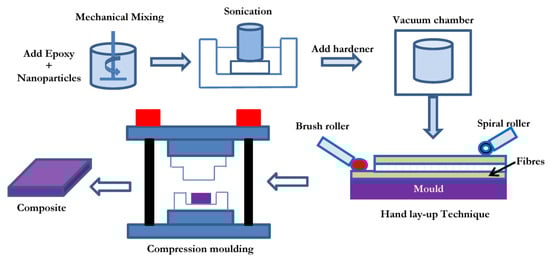 Both conventional (MWCNT, GNP) and hybrid (MWCNT + GNP) composites were manufactured by the compression moulding process. A schematic of the manufacturing process is shown in Figure 1. The vacuum of one atmosphere was maintained for about 12–15 h until the end of the curing process at room temperature to constrain the void formation through polymerisation. A mechanical convection oven was used for post-curing at 110 °C for 3 h. Three different configurations of fibres were used: unidirectional (UD), cross-ply (CP), and angle-ply (AP). The stacking sequence of these laminates is shown in Figure 2.
