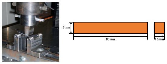 The ILSS test was performed as per the ASTM D2344 standard, as shown in Figure 5. The specimen was placed on a horizontal shear test fixture and applied transverse loading was at a rate of 1.27 mm/min until the failure of the specimen. The tests were performed on an Instron 785 UTM with a 20 kN load cell. The upper roller diameter was 10 mm and the diameter of the lower rollers was 5 mm.