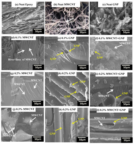 The dispersion of nanofillers in the matrix is shown in Figure 6 through SEM micrographs. Micrographs in Figure 6g–i with 0.2% MWCNT, 0.2% GNP, and 0.2% (MWCNT + GNP) dispersion showed good and uniform dispersion with no noticeable agglomeration. The MWCNT and GNP fillers interlocked and entangled with the polymer chains of the resin; some MWCNT and GNP were broken in a brittle manner and pulled out at the ends of the surface. The 0.3% MWCNT and GNP fillers showed agglomeration in the solution, which caused the van der Waals interactions. Agglomeration of MWCNT and GNP reduces the strength of the nanocomposites by the stress concentration effect. To overcome the attraction of van der Waals forces, many researchers suggested maintaining proper ultrasonicator and high-speed shear mixing [52]. However, optimum loading and uniform dispersion of nanofillers are key input parameters to promote interfacial bonding between CNF matrix interfaces to carry the efficient load between the two constituents of nanofillers [36].