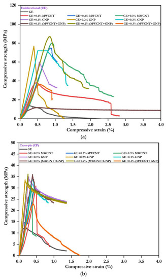 The following sections presented the quasistatic compression, flexural, and ILSS properties of GE composites filled with different MWCNT, GNP, and hybrid combinations of MWCNT + GNP. The influence of nanofillers on the GE composites with different fibre orientations such as UD, CP, and AP was presented. In the case of failure analysis, due to a huge number of figures, only the failure of UD laminates was presented in the main manuscript. The SEM failure of CP and AP laminates was provided as a supplementary file.