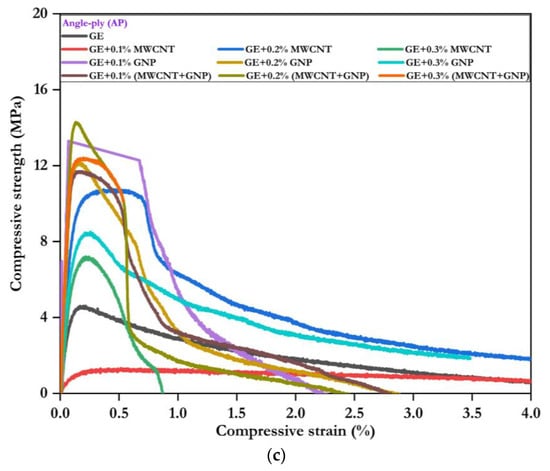 Compressive stress–strain response: (a) UD, (b) CP, and (c) AP.